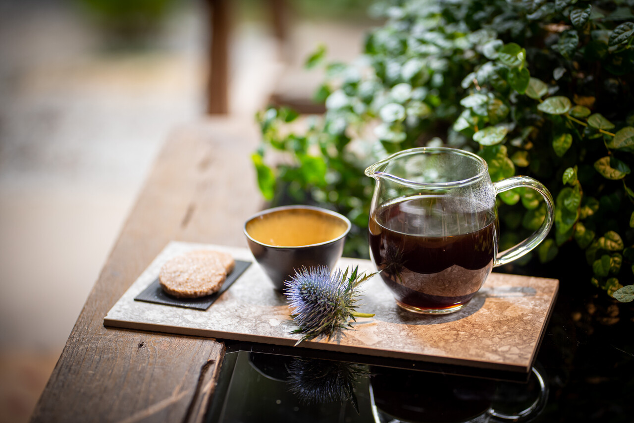 庭院放置著低矮木桌椅,西式洋柱支撐著二樓的陽台,紅磚堆砌而成的宅邸帶著傳統街屋與巴洛克風格的元素,戶外庭園微風徐徐、鳥蟬鳴鳴,陽光灑落穿透交流於光影之間。此空間有著時間累積,無法複刻的美,彷彿當年富貴人家、1920的臺北,磚磚瓦瓦內望外、外看內,從不同視角,端看空間,皆有不同情調。以空間細節、氣味光線……再再召喚著大稻埕曾經的美好時光,穿越百年,與我們相遇。